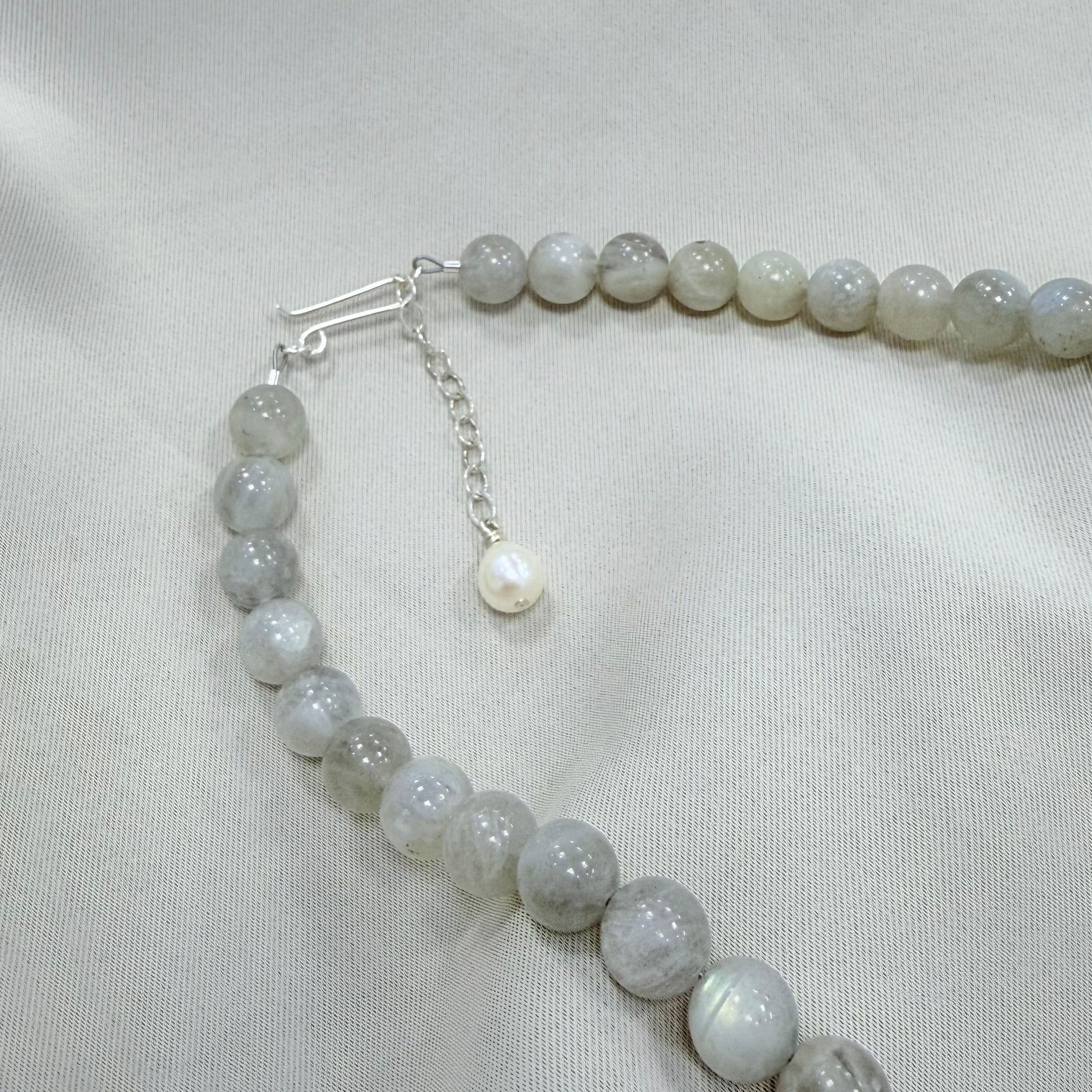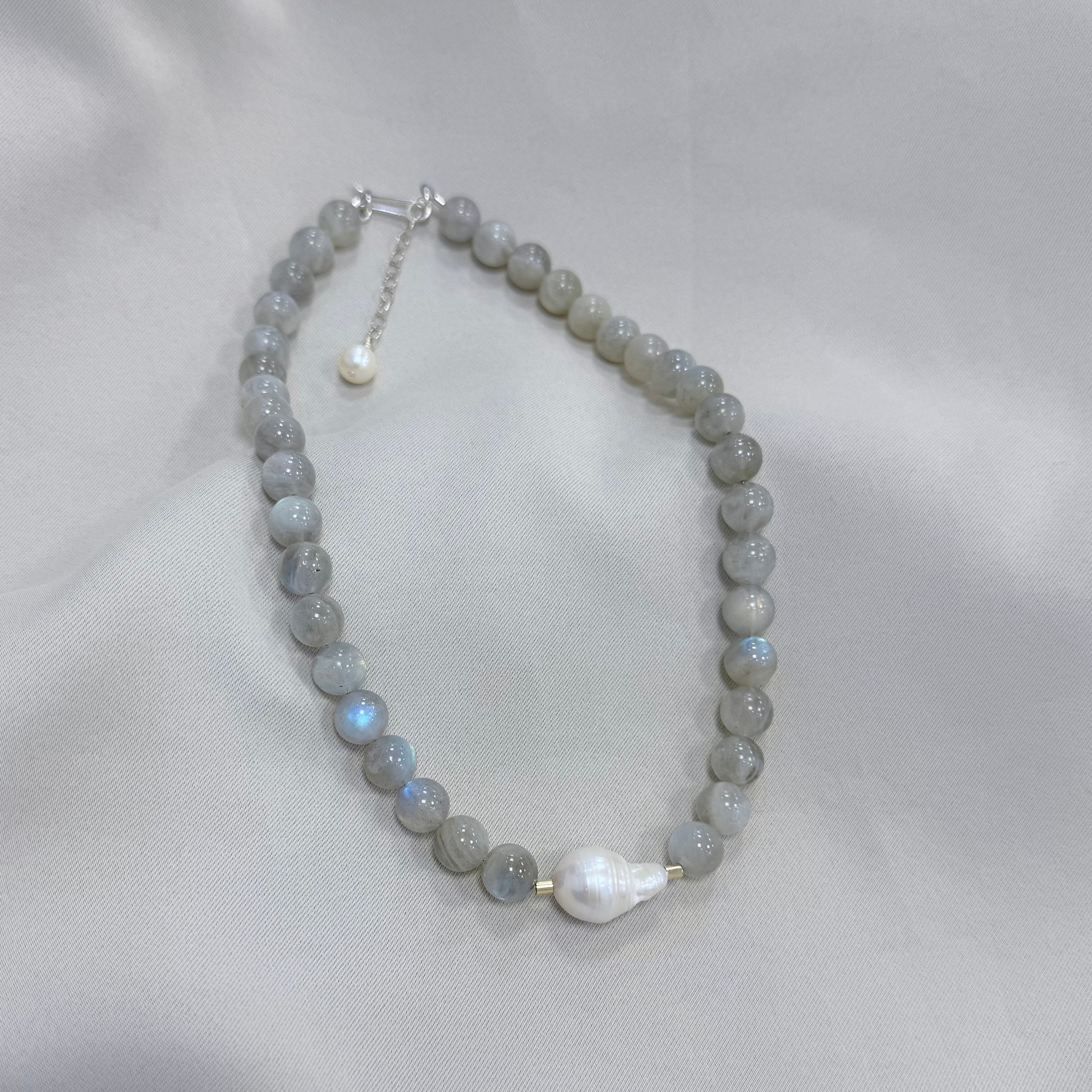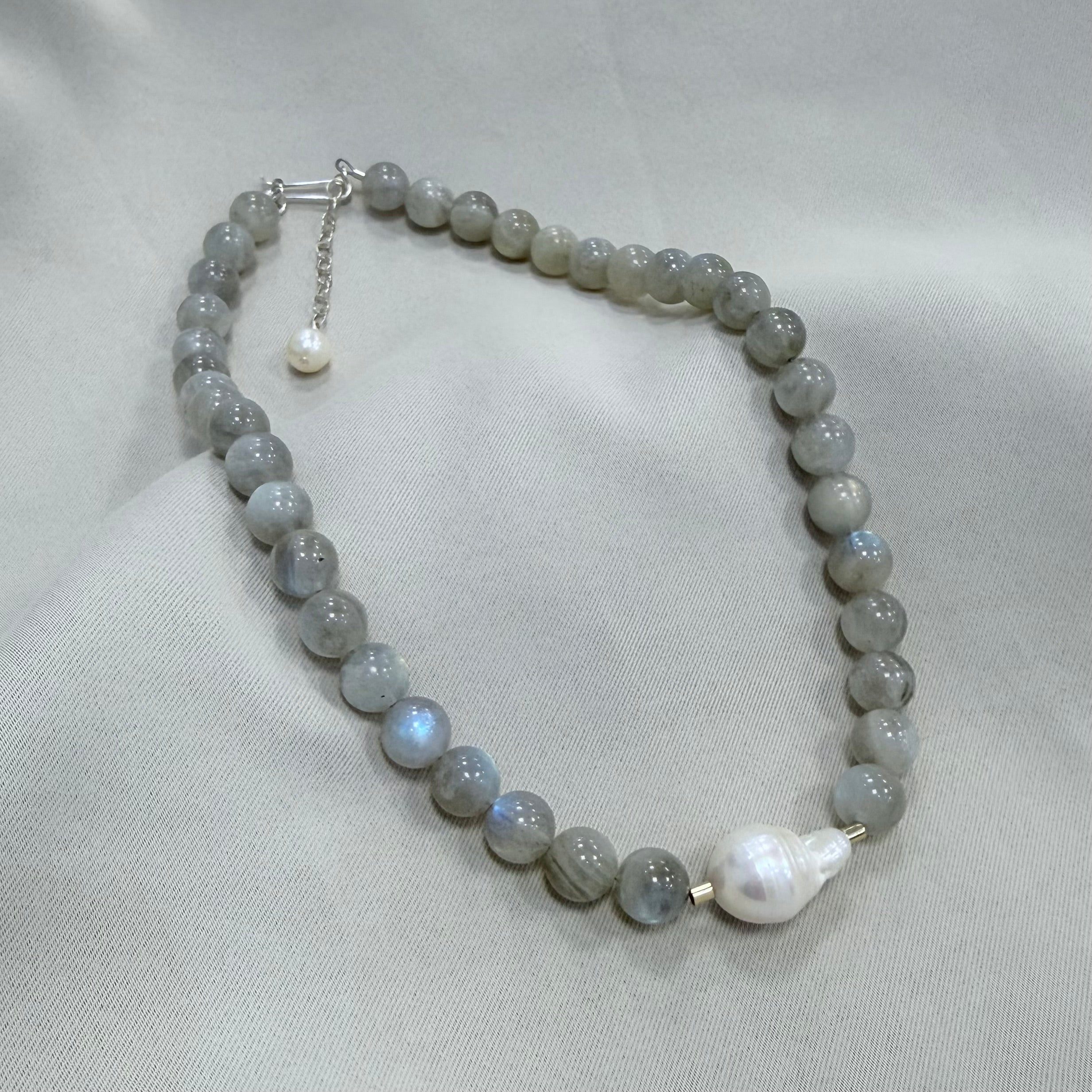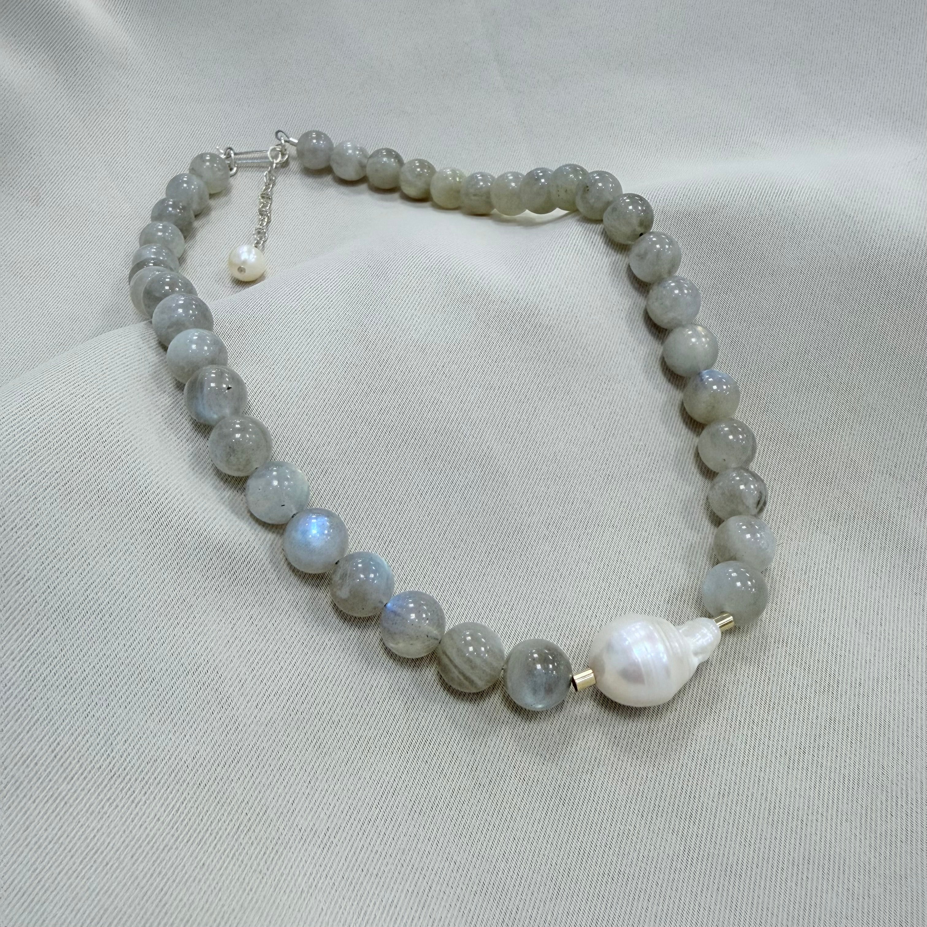 Materials: Labradorite Gemstones, Freshwater pearl, Gold-filled details, sterling silver clasp.