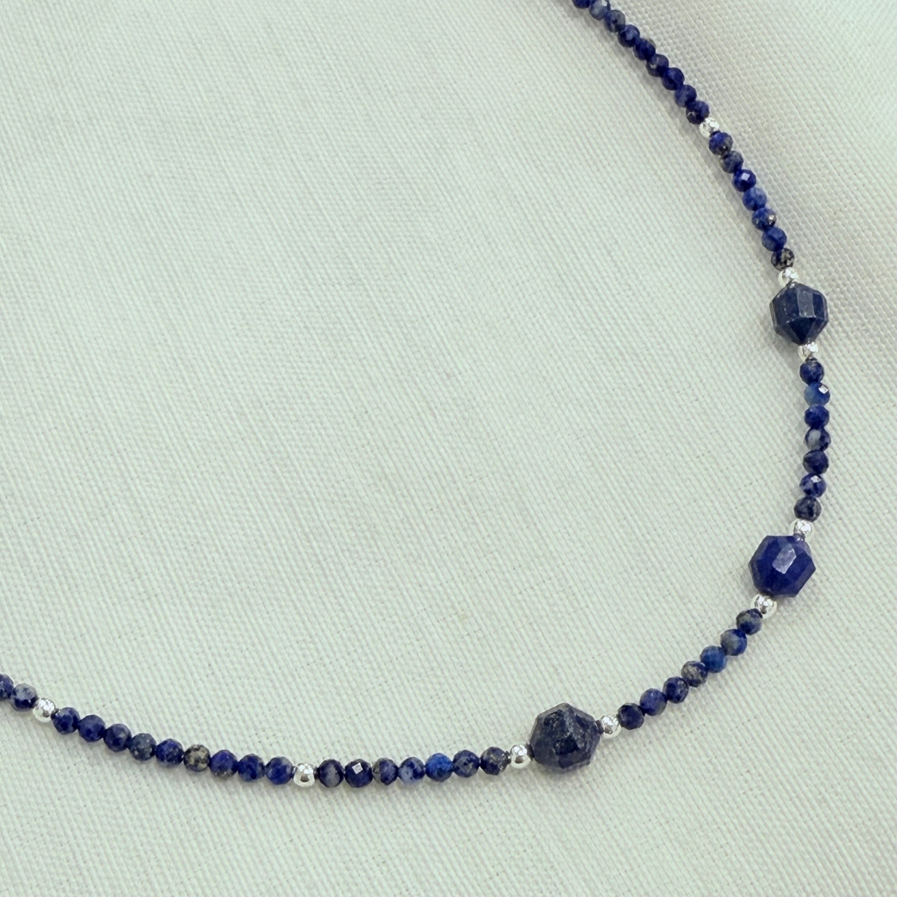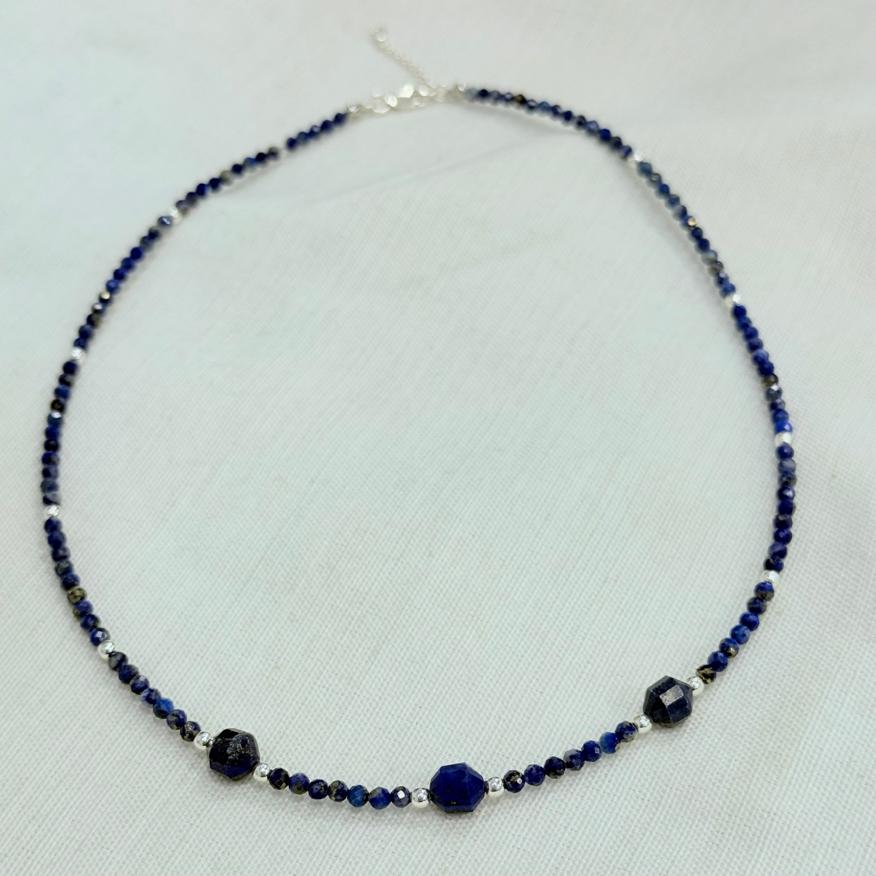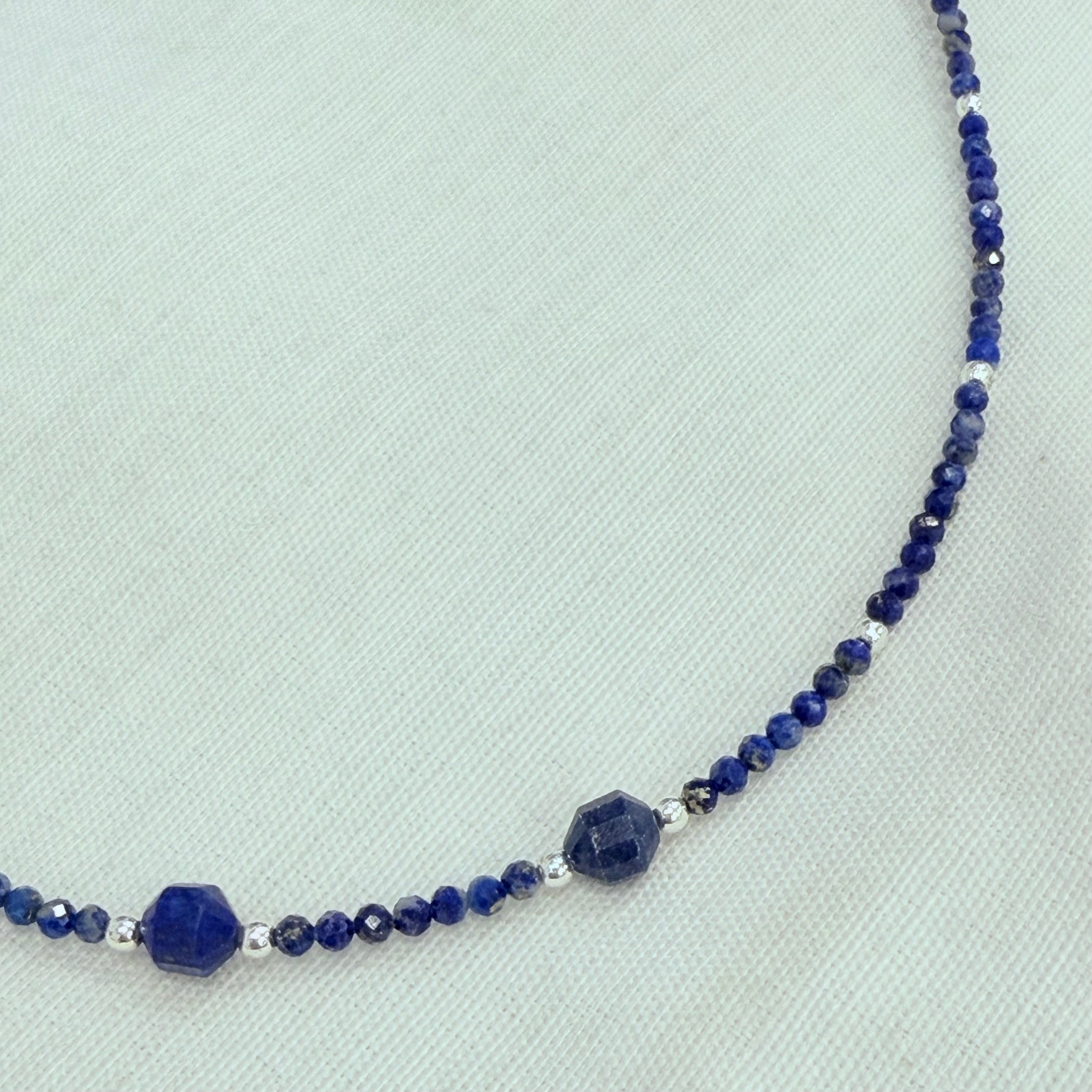 Features dainty faceted Lapis Lazuli beads and barrel details. This necklace radiates deep royal blue, symbolizing wisdom and truth.