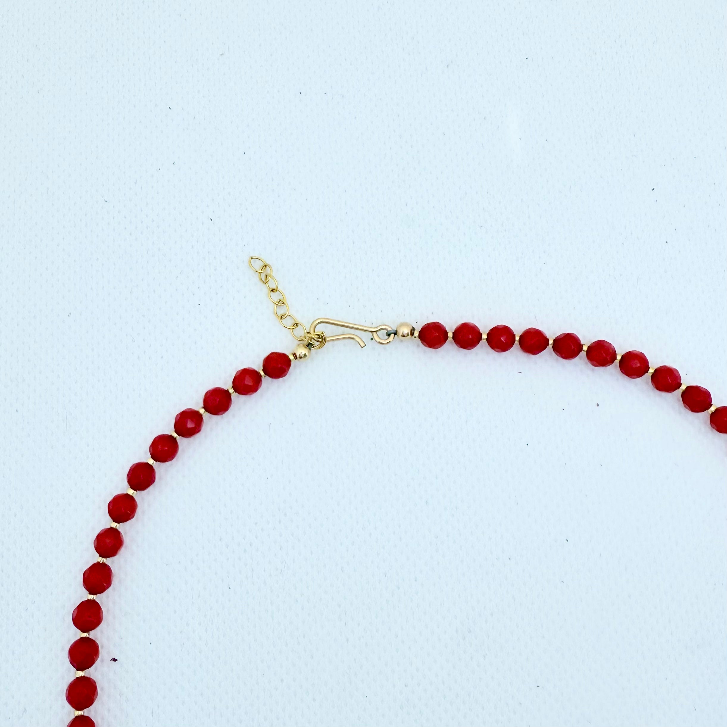 Materials: Faceted round sea bamboo stones, 14k gold-filled accents, and a large cinnabar pendant 2"x 2" approx.