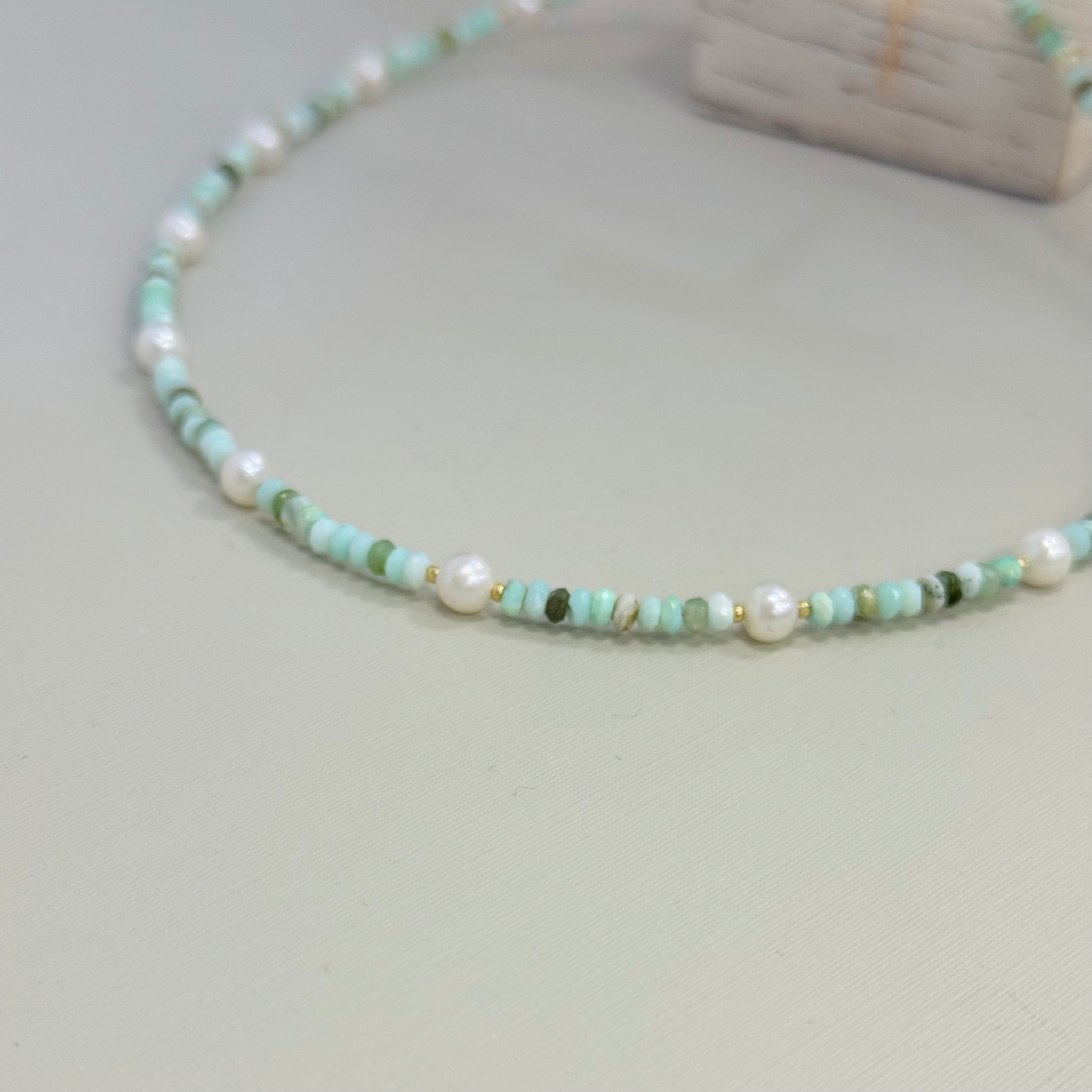 Materials: Chrysoprase (turquoise/khaki green) beads, freshwater pearls, seed beads, and 14 k gold-filled clasp