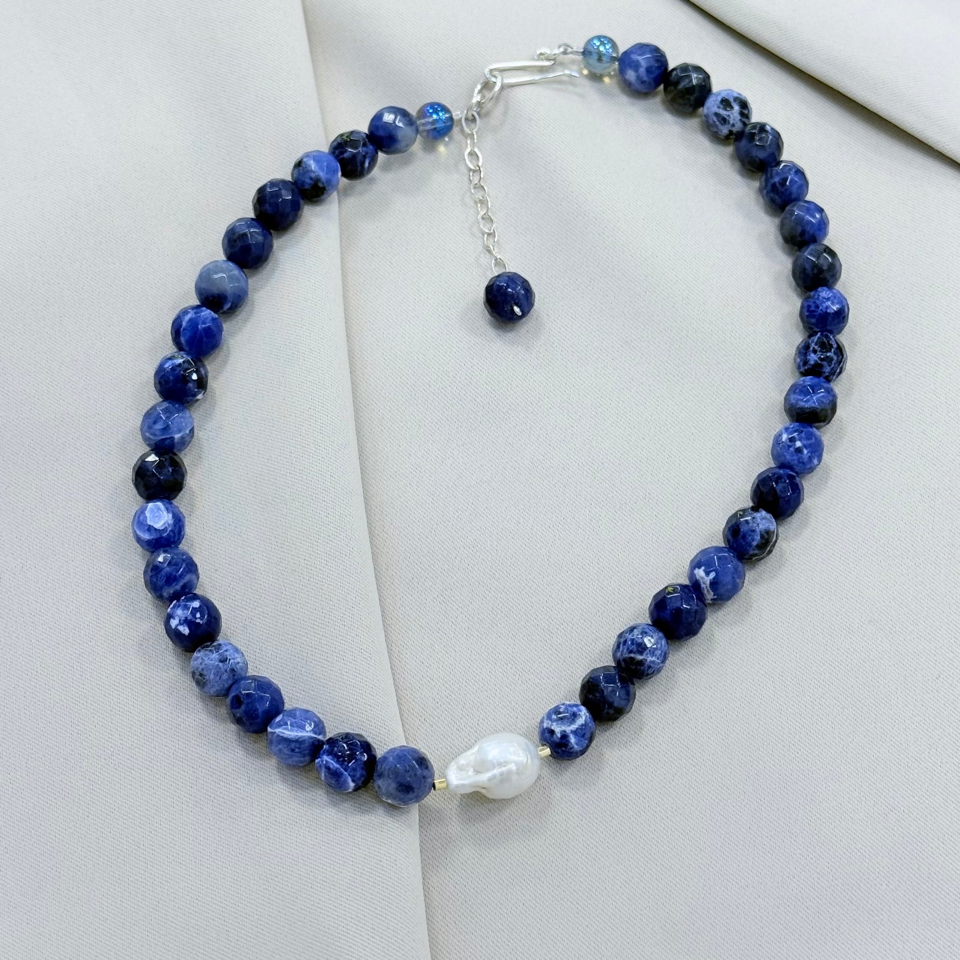 Materials: Baroque pearl, sodalite gemstones, sterling silver chain, and clasp.