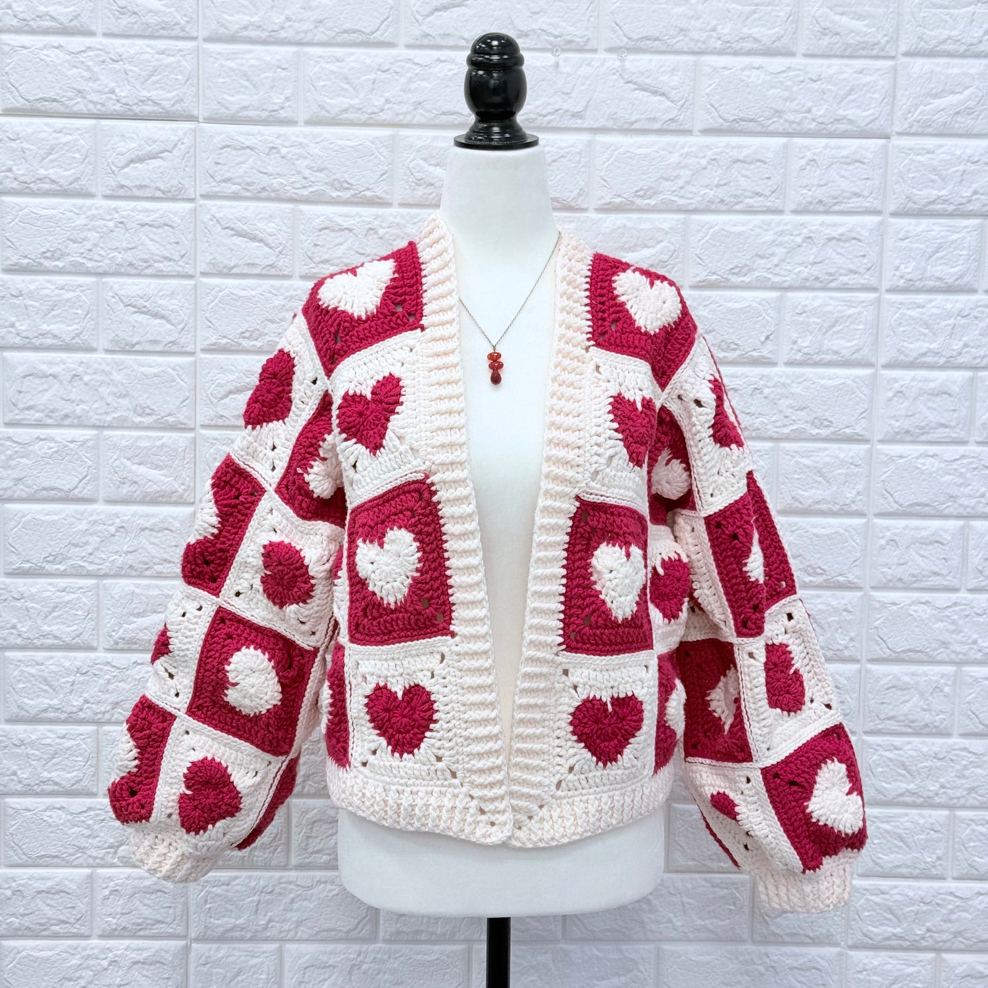The patchwork of hearts makes this cardigan unique. Hand crochet in Calgary, this piece is a work of art and a must-have to your wardrobe. Perfect to keep you warm and stylish.