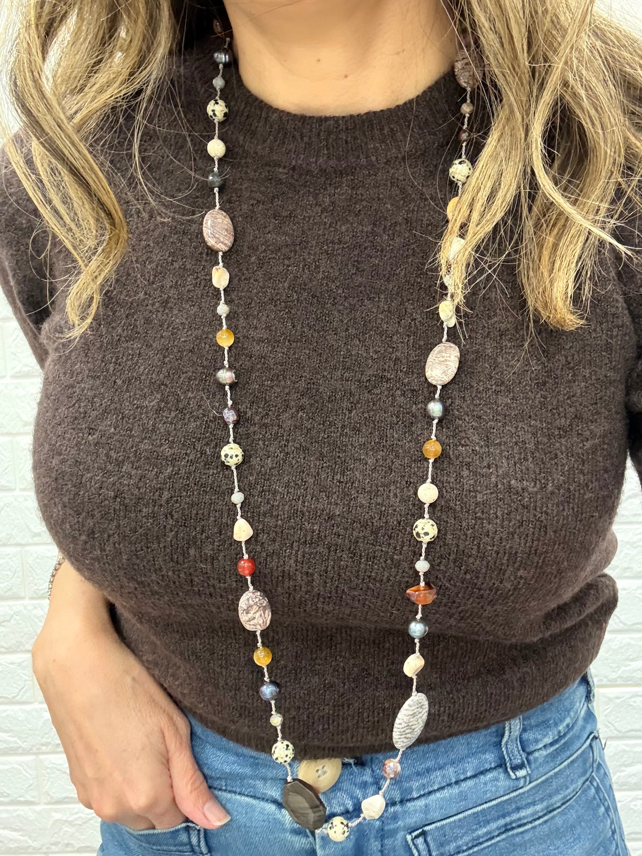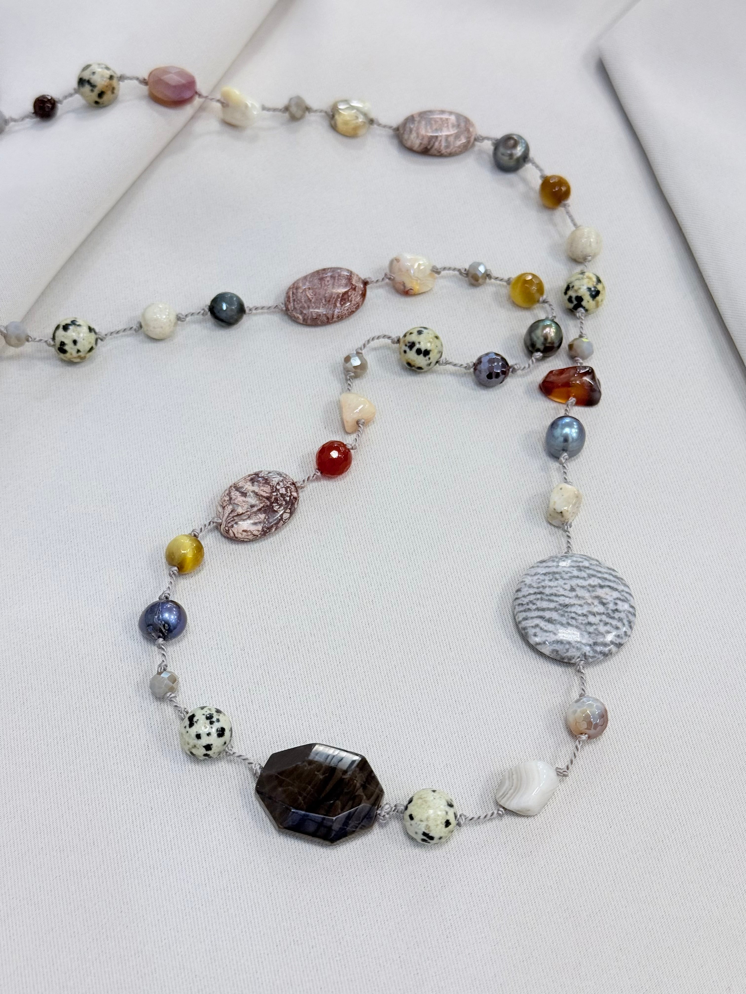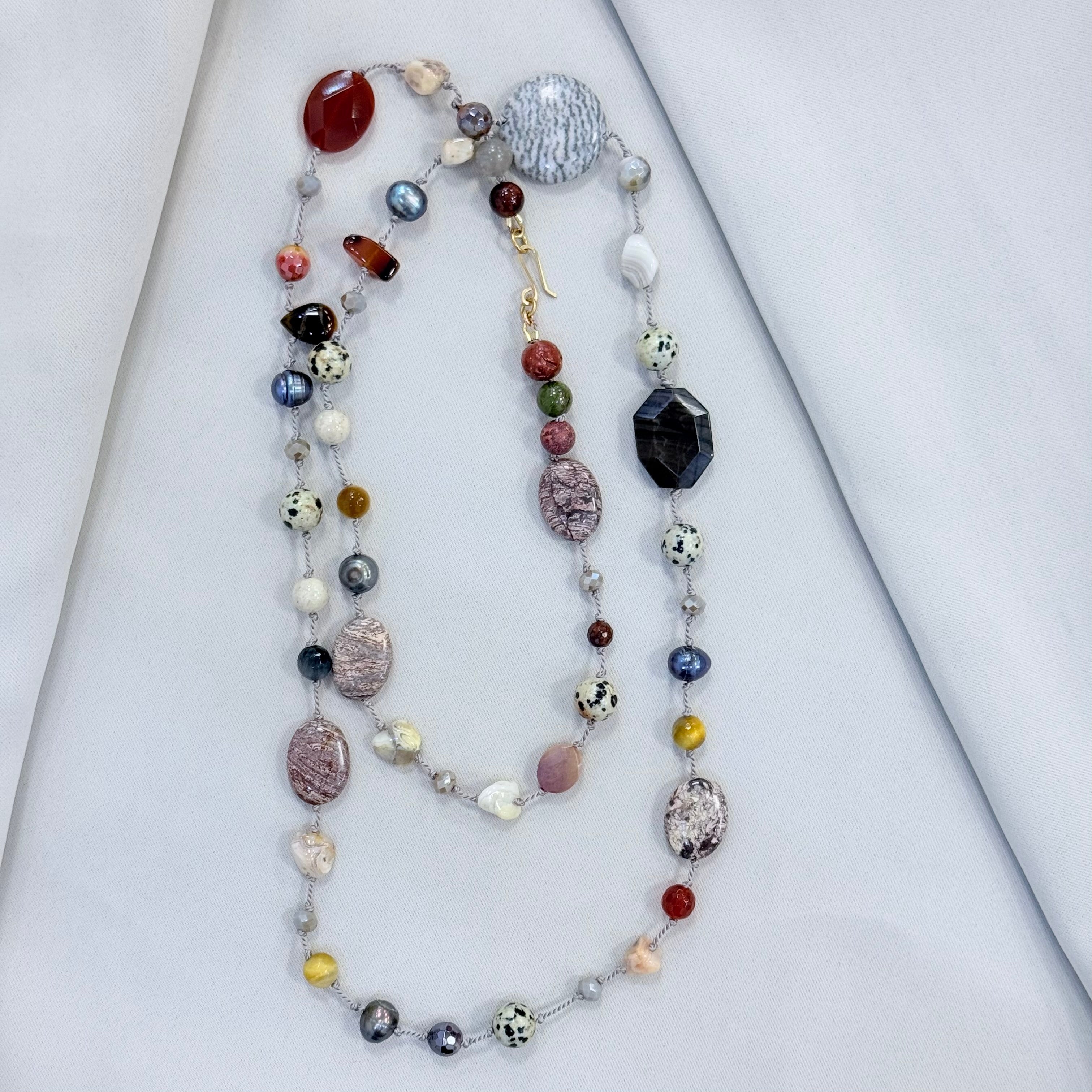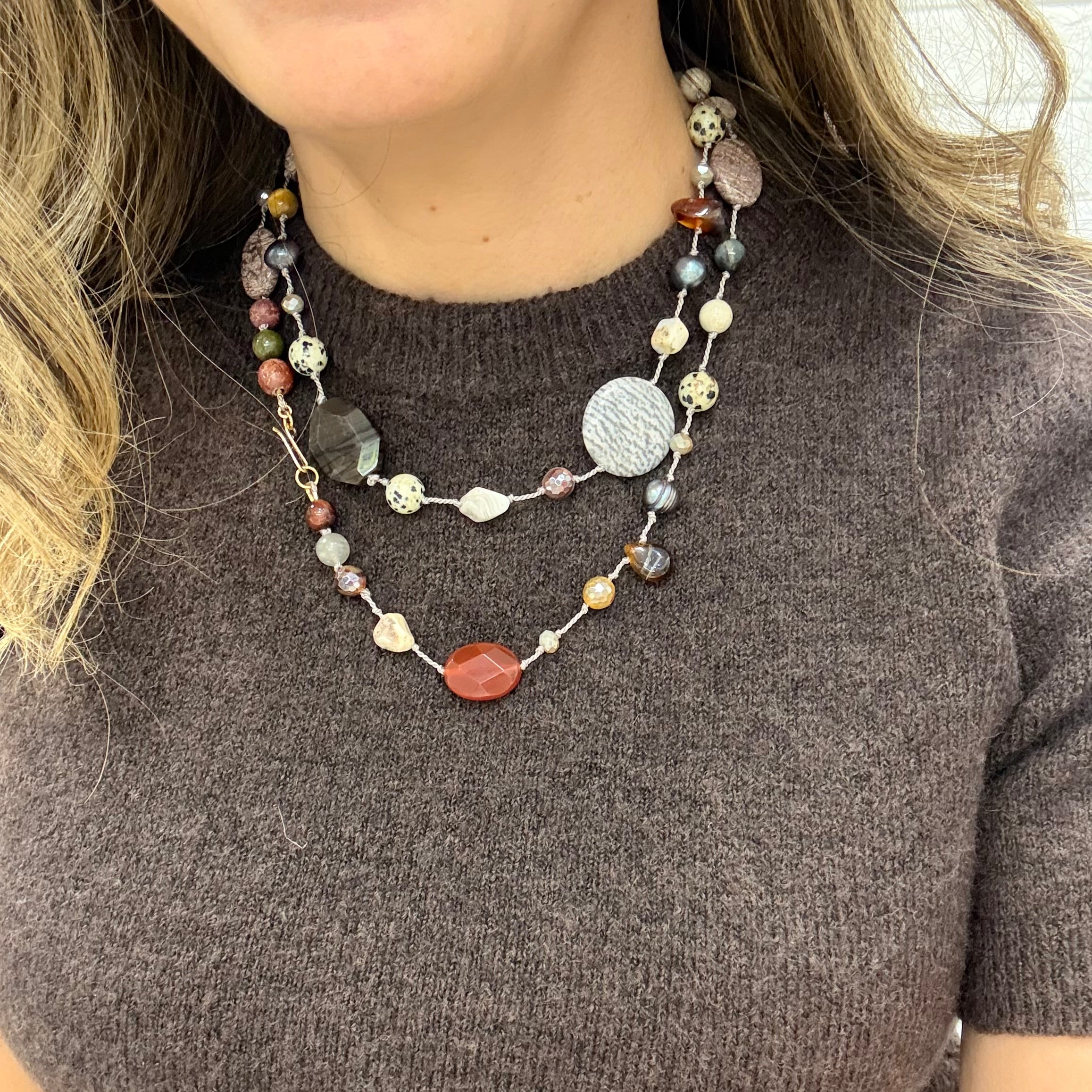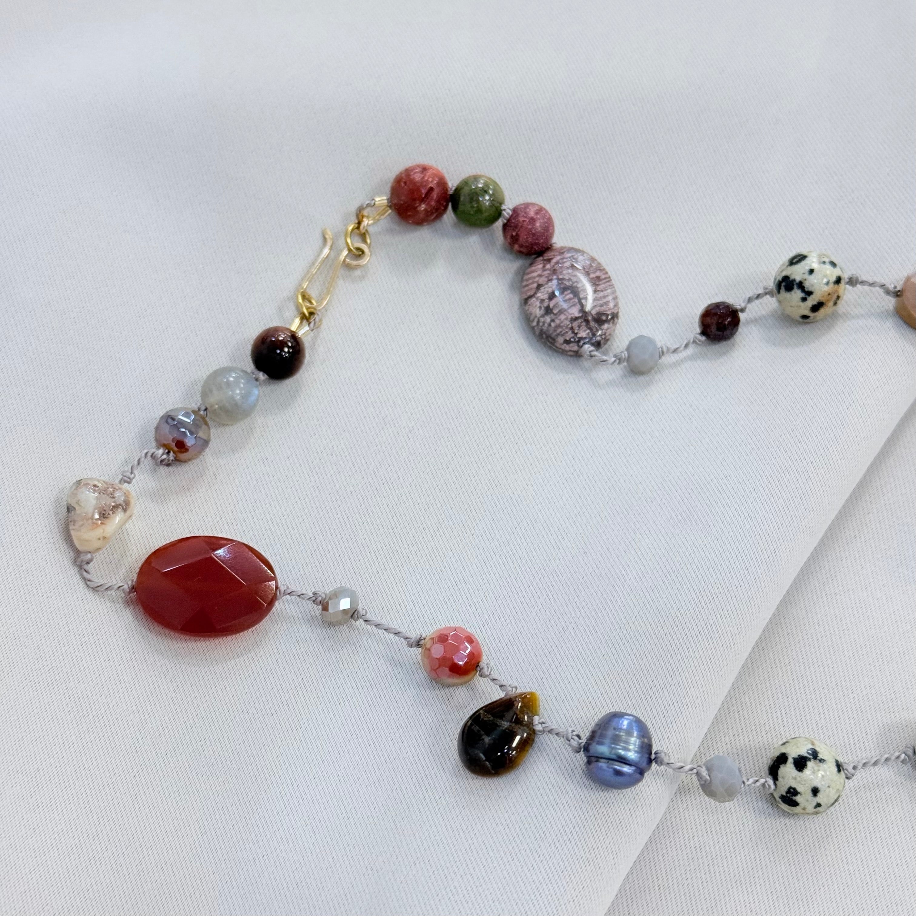 Materials: Multicolor Tiger Eye gemstones, freshwater pearls, brown picasso jasper, carnelian, crazy lace agate, dalmatian gemstones, brown faceted jasper, gold-filled clasp.