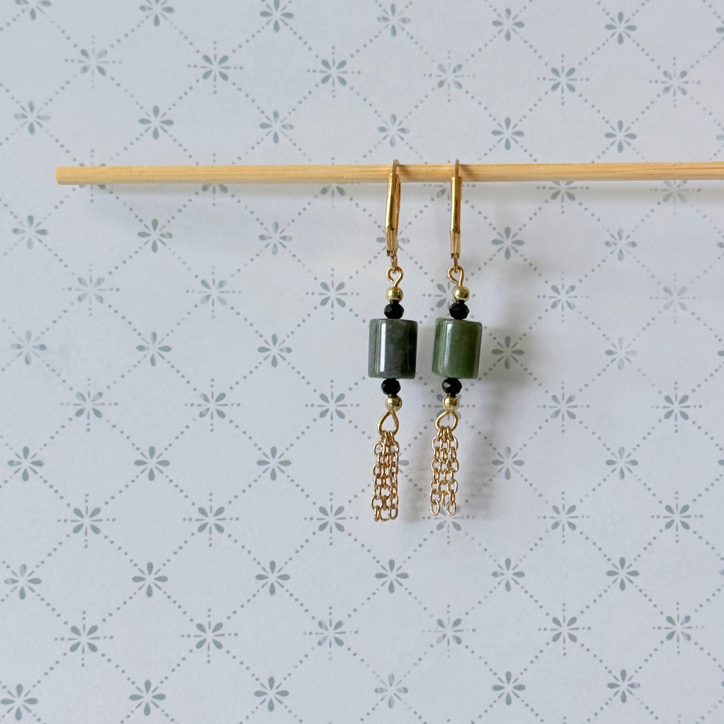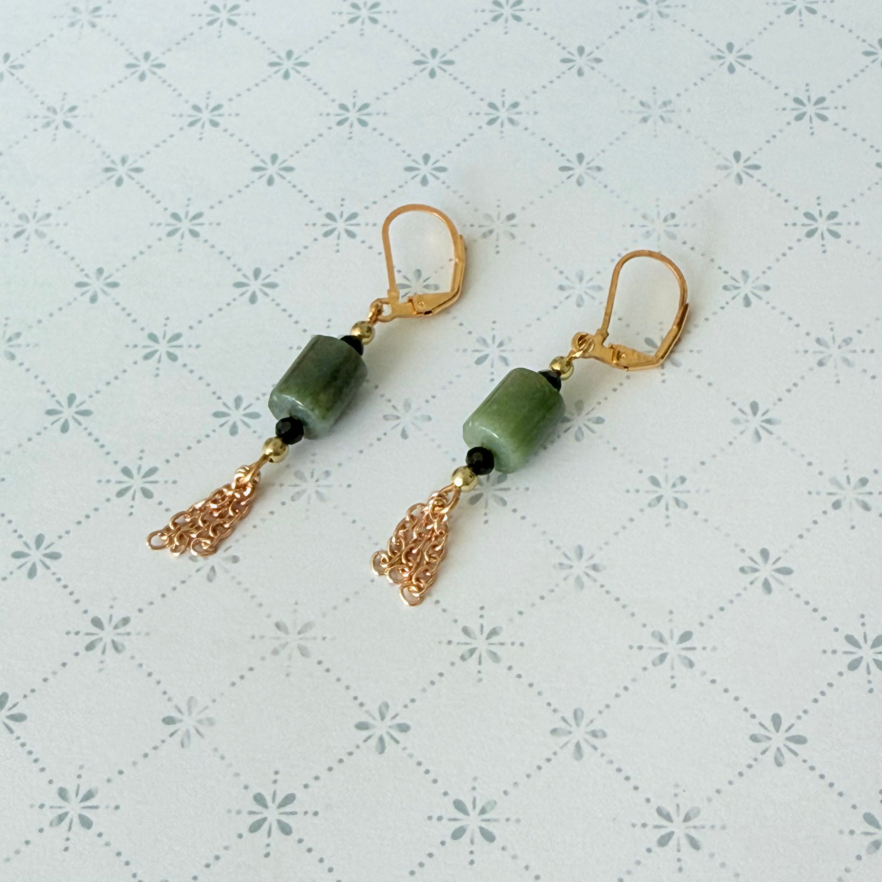 These luminous earrings bring together natural green gemstones and warm 18k gold-plated accents for a look that’s both grounded and elegant. Each pair is handcrafted with care, featuring smooth jasper stones framed in a graceful gold design with chain details.
