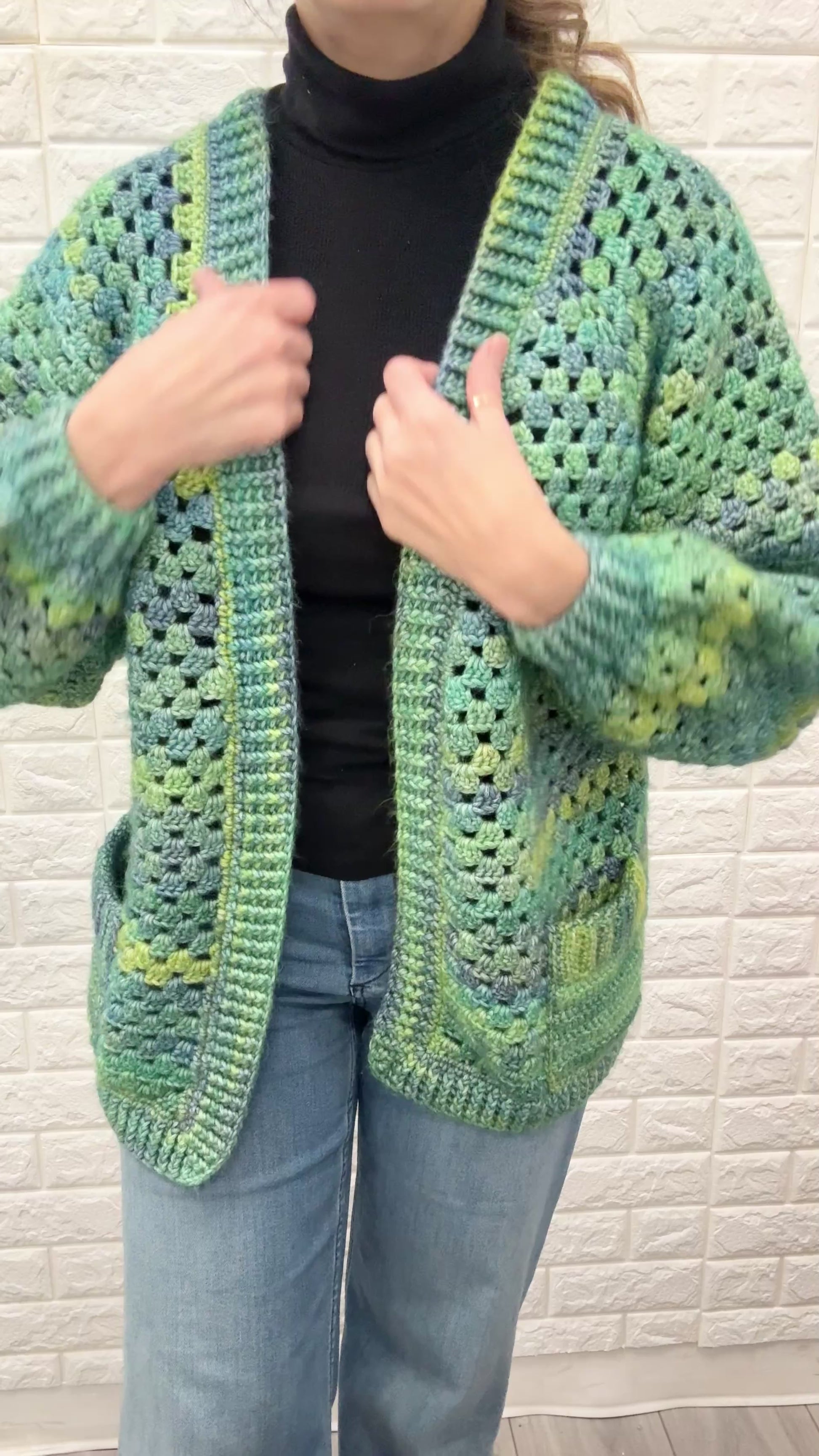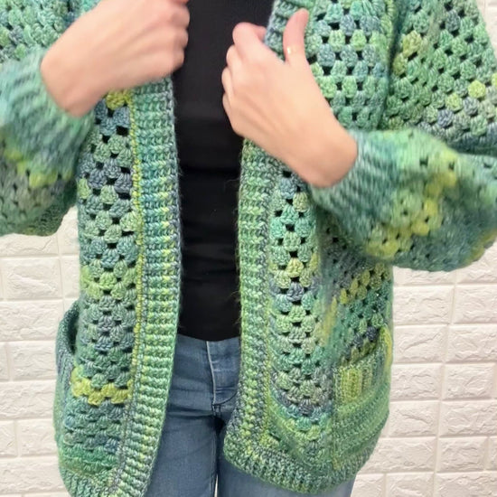 The patchwork of colors and patterns makes this cardigan unique. Hand crochet in Calgary, this piece is a work of art and a must-have to your wardrobe. Perfect to keep you warm and stylish.
